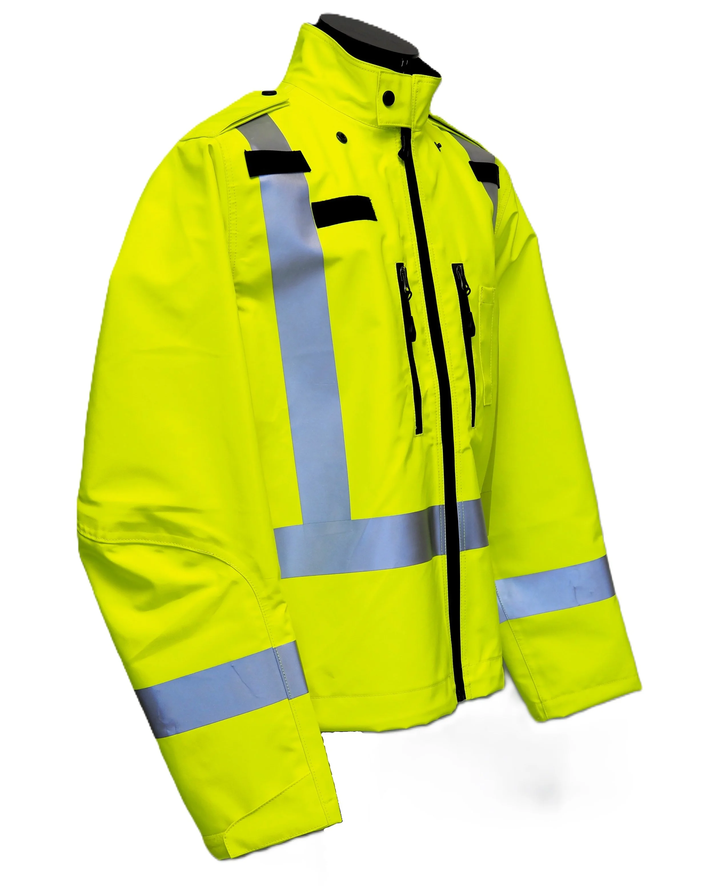 Our most popular stretch shell bomber length jacket. When being seen is critical to your safety — this is the jacket you should wear. It is waterproof, windproof and breathable making it an ideal duty jacket. This one is packed with purposeful design features including zippered storage pockets, two-way side zips, articulated arms and is fully seam sealed. Exceeds CSA-Z96-22 visibility standards with the addition of vertical 3M™ retroreflective sleeve stripes. Can be worn with a soft shell or WindBlock layer for added warmth. Two colors or one the choice is all yours.